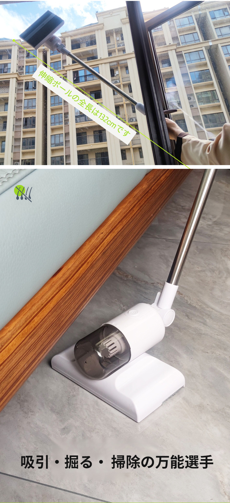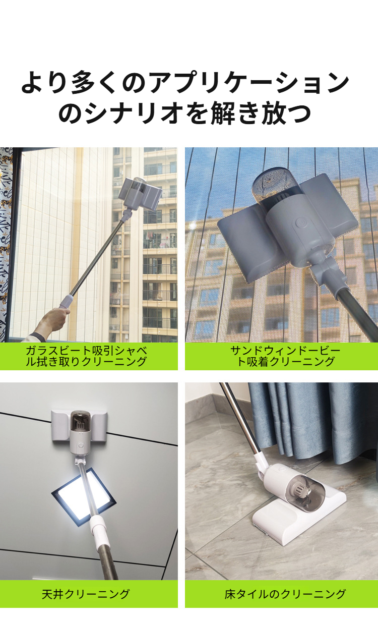 伸縮式ハンドル付きガラス掃除機の使用例